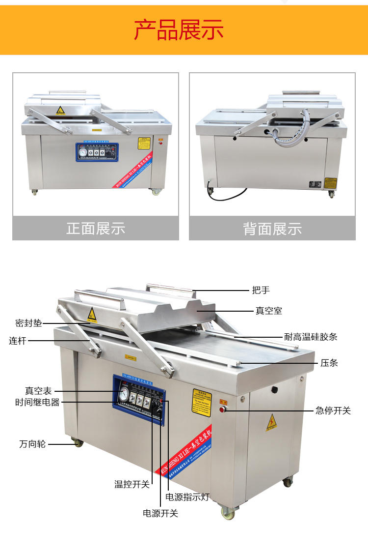 真空包裝機(jī)是將包裝袋內(nèi)抽成真空(充氣),然后封口,使袋內(nèi)形成真空,從而可使被包裝物品達(dá)到隔氧、保鮮、防潮、防霉、防銹、防蝕、防蟲、防污染等目的,有效地延長保質(zhì)期、保鮮期,便于存放和運(yùn)輸。我公司生產(chǎn)的真空包裝機(jī)適用于各種塑料復(fù)合薄膜或鋁箔復(fù)合薄膜袋,對各類生熟食品、果品、土特產(chǎn)品、藥材、化學(xué)品、精密儀器、服裝、五金產(chǎn)品、電子元器件等各種固體、粉狀物體、液體進(jìn)行真空包裝。采用數(shù)顯時(shí)間繼電器控制,304不銹鋼制作,真空室及工作臺為3mm不銹鋼板,采用雙向閥控制下抽式抽氣方式,真空管及密封墊為硅膠材質(zhì),帶油水分離裝置。